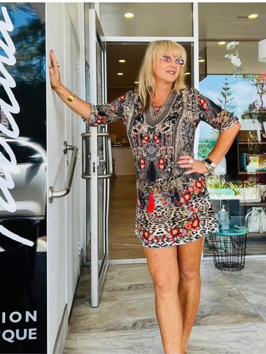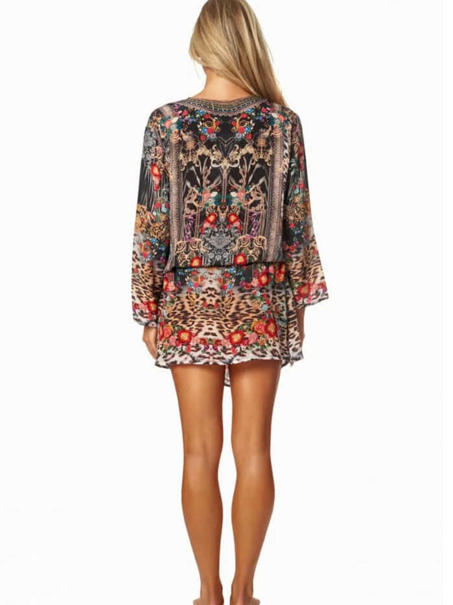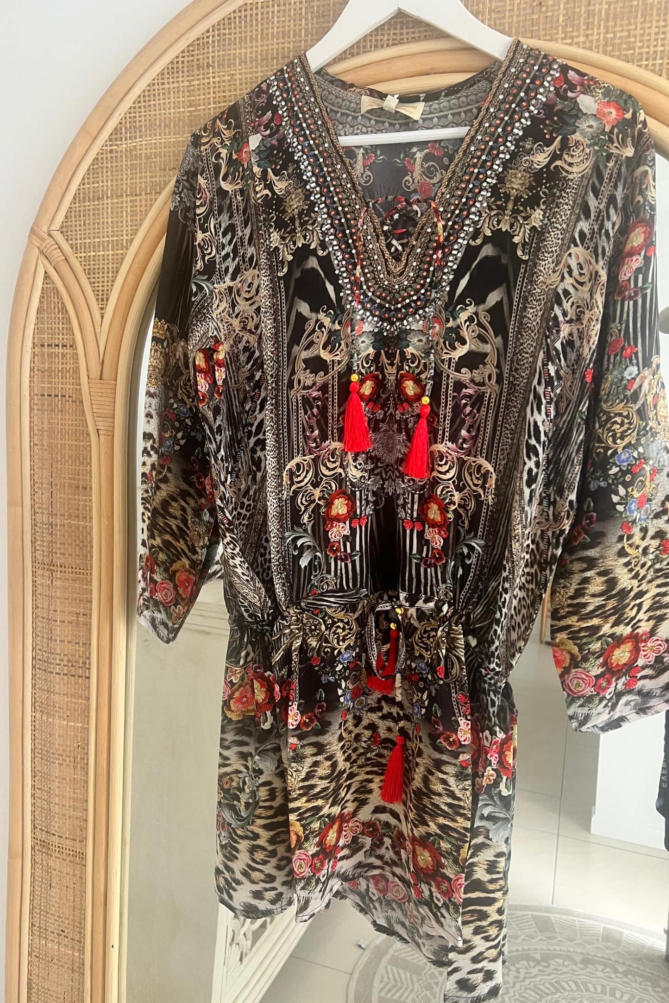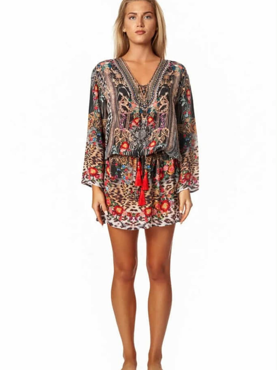 Our Electric Jungle Summer Dress is the perfect addition to your wardrobe or next vacay!  This comfy stylish dress will take you from beach to bar effortlessly she's also got sleeves for those that like a bit of coverage.  Detailed embellished V-Neckline every so flattering drawstring waist tie draw in or wear loose for a more casual resort look.